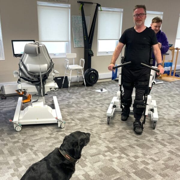 Alan has recently visited Active Neuro Rehabilitation Hub – Gateshead for a 4-hour initial assessment that was split over two days. Alan underwent a full movement assessment to ascertain which patterns of his movement were compromised which muscles he was not using correctly and what compensatory strategies he had employed to enable him to function. Following this Alan experienced the appropriate specialist rehabilitation equipment to meet his needs; the C-Mill Treadmill’s capacity is to measure balance equilibrium and pattern of walking thus allowing the therapist to set a rehabilitation programme to work on the deficits. Functional Electrical Stimulation was used to explore and gain appropriate muscle activity to further improve more efficient movement patterns. Alan used the ExoMotus™ M4 exoskeleton gait re-trainer to facilitate a more normal pattern of walking, carrying this over into his everyday life. He has expressed that he has felt an improvement in his walking since using the equipment.